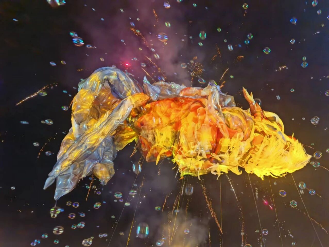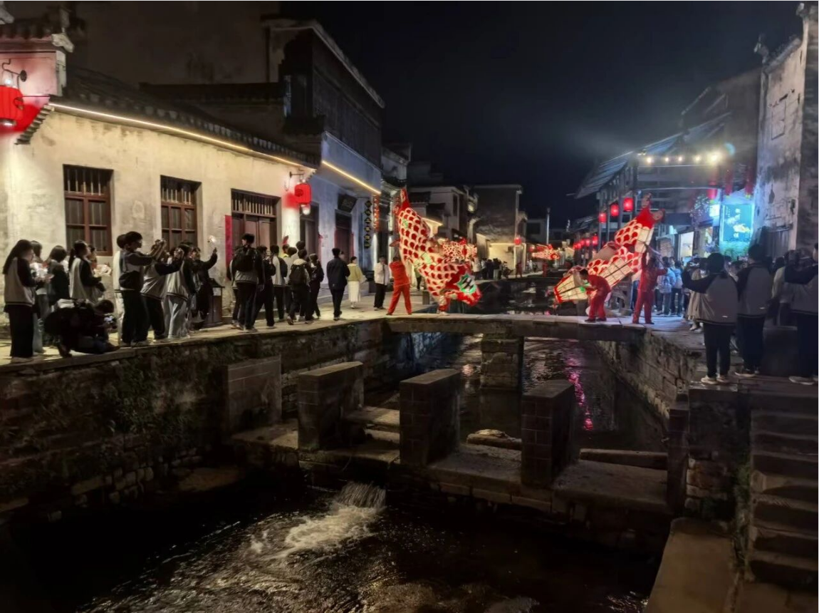锣鼓开道,烟花绽放,鱼王灯领衔,数十盏鱼灯沿溪而行,灯影流转,宛如活鱼游动。配合打铁花、抖火壶等非遗表演,整座古村在灯火中苏醒。“鱼”谐音“余”,寓意年年有余、平安顺遂。